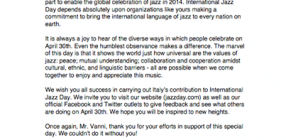 ✔ HERBIE HANCOCK for JAZZIT CLUB @ INTERNATIONAL JAZZ DAY ROMA. Una bella emozione ricevere questa lettera firmata da HERBIE HANCOCK e dal Presidente del Monk Institute of Jazz TOM CARTER che suggella la celebrazione della “Giornata Internazionale del Jazz” (mercoledì 30 aprile, a partire dalle ore 20.30) presso il