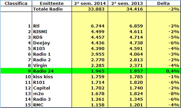 Tra le prime 15 emittenti nazionali Radio 24 è l’unica a crescere nel secondo semestre 2014 rispetto al secondo semestre 2013, in netta controtendenza rispetto al mercato.